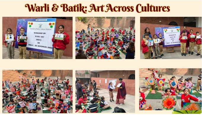 Students enthusiastically participated in an enriching art workshop that introduced them to two beautiful traditional art forms—Warli Art from India and Batik Art from Indonesia. During the session, they learned about the cultural origins and distinctive styles of these art traditions. Warli art, known for its simple geometric figures and earthy tones, depicts scenes of village life, nature, and celebrations, reflecting the deep connection between people and their surroundings. Batik art, on the other hand, is admired for its intricate patterns and vibrant colours that traditionally decorate textiles in Indonesia.